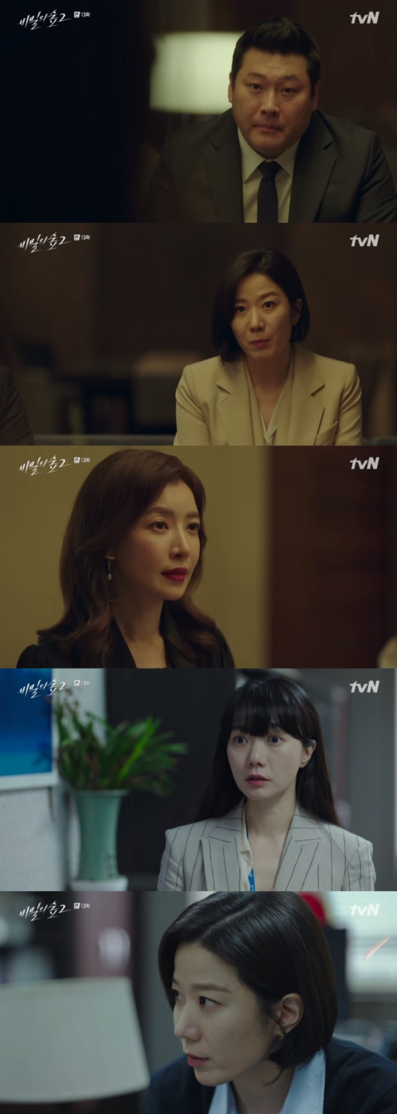 26일 방송된 tvN 주말드라마 '비밀의 숲2'에서는 한조그룹의 회장 이연재(윤세아 분)를 찾아간 우태하(최무성 분)와 최빛(전혜진 분)의 모습이 그려졌다.