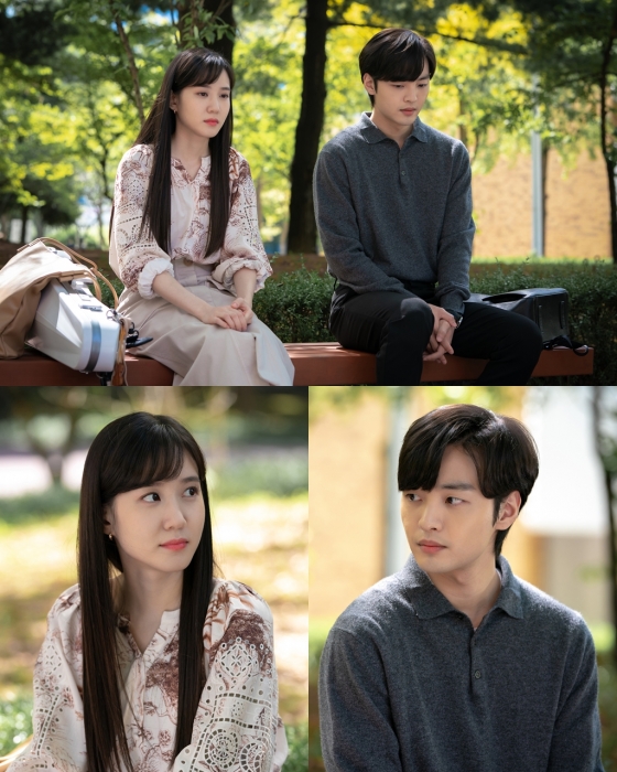 공개된 사진 속 벤치에 나란히 앉은 채송아와 박준영은 각자의 생각에 빠진 듯하다. 함께 있는데도 쉽게 말을 꺼내지 못하는 모습인 것. 그러나 결코 냉랭한 분위기는 아니다.