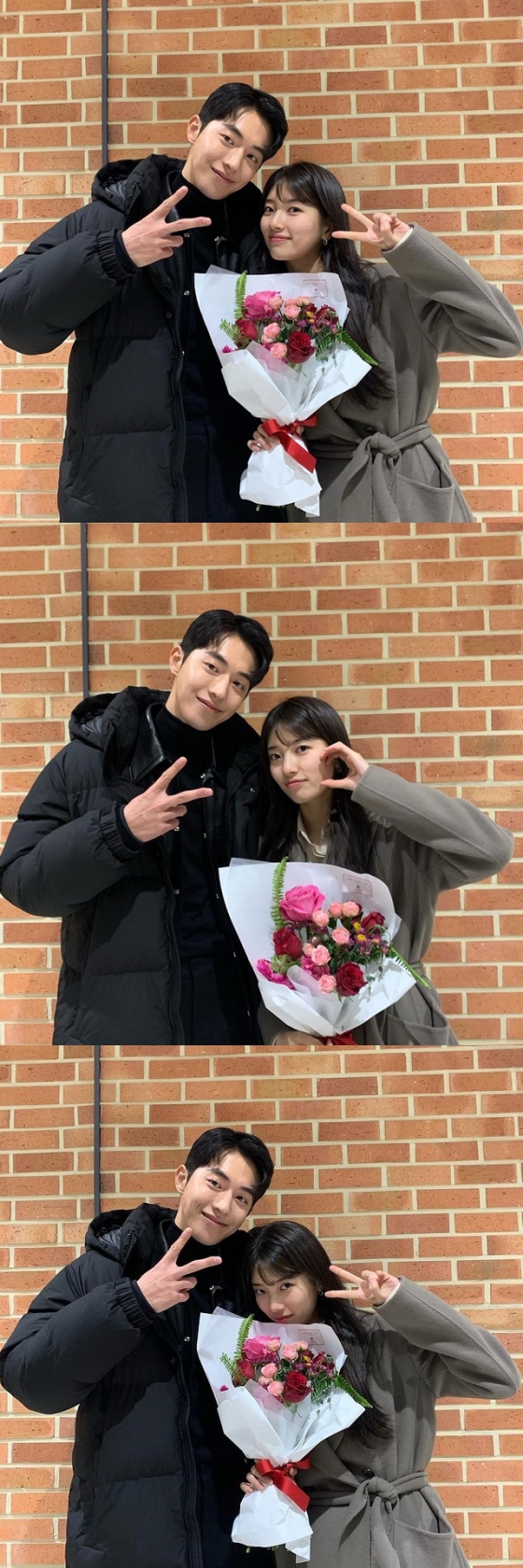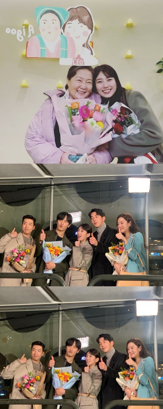 공개된 사진 속에는 드라마 '스타트업'에서 촬영을 같이한 배우 남주혁과 김선호, 스테파니 리, 김혜숙이 수지와 함께 환하게 웃고 있다. 서로 환하게 웃으며 정면을 바라보는 모습이 훈훈함을 자아낸다.