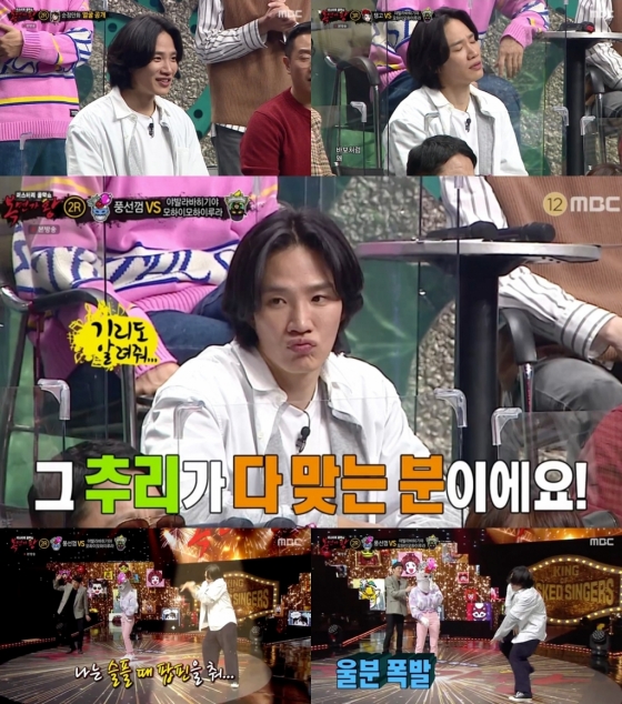 김기리는 복면 가수들의 노래에 맞춰 춤도 추고 즐거워하며 다양한 리액션을 폭발 시켜 복면 가수들의 무대를 200% 즐기는 모습을 보여주며 안방극장에 웃음을 안겼다.