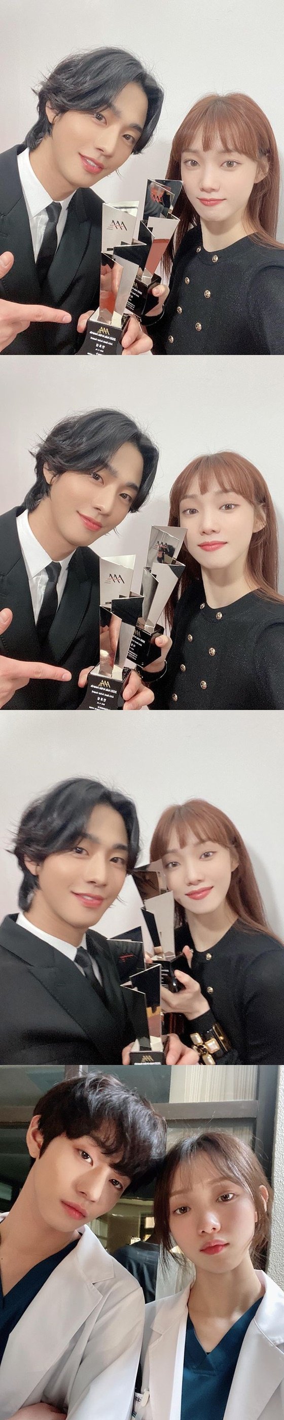 공개된 사진 속 이성경은 안효섭과 함께 2020 AAA 베스트 엑터상을 수상한 뒤 받은 트로피를 들고 인증샷을 찍고 있다. 드라마 '낭만닥터 김사부2'에서 호흡을 맞췄던 만큼 남다른 케미스트리가 흐뭇함을 자아낸다. 뿐만 아니라 '낭만닥터 김사부2' 비하인드컷을 공개해 시선을 끈다.