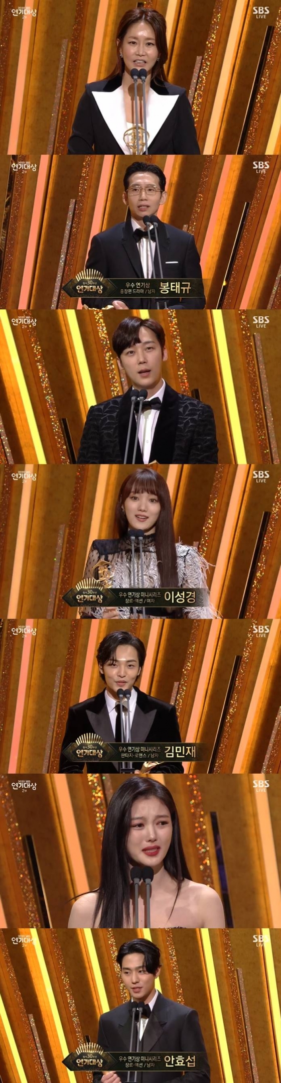 배우 김민재, 김유정, 안효섭, 이성경, 봉태규, 윤종훈, 신은경이 '2020 SBS 연기대상' 우수 연기상을 수상했다.