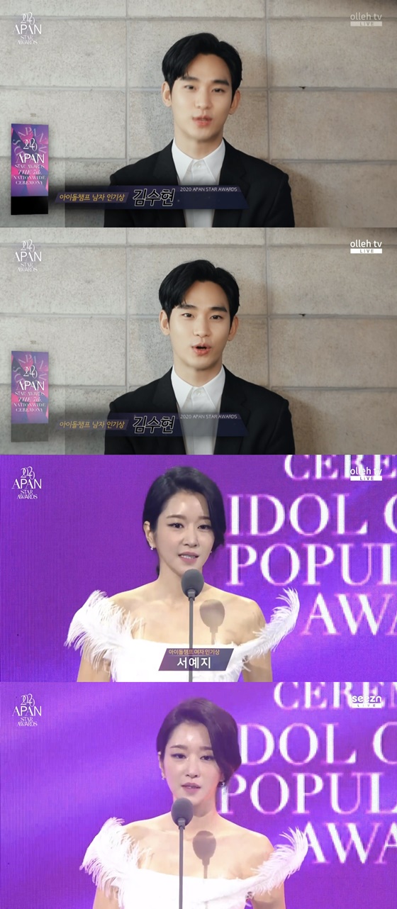 배우 김수현과 서예지가 '2020 APAN AWARDS' 남녀인기상을 수상했다.