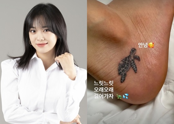 김세정은 지난 25일 자신의 인스타그램 스토리에 자신의 발목 위에 있는 거북이 문신 사진을 올렸다. 김세정은 "안녕 느릿느릿 오래오래 걸어가자"라는 글로 마음을 전했다.