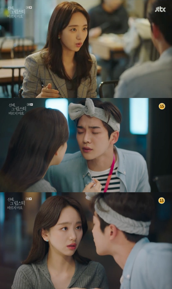 '선배, 그 립스틱 바르지 마요'의 로운과 원진아가 제품 테스터 중 얼굴을 가까이 마주했다.