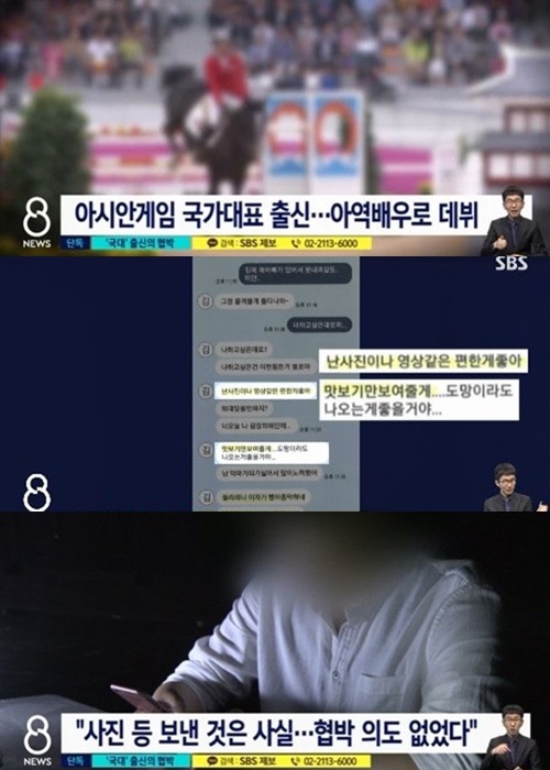 지난 4일 SBS 'SBS 8 뉴스' 측은 "승마 국가대표 선수 A씨가 만나다 헤어진 여성 B씨에게 동의 없이 촬영한 사진과 영상을 보내며 협박했다"라고 보도했다.