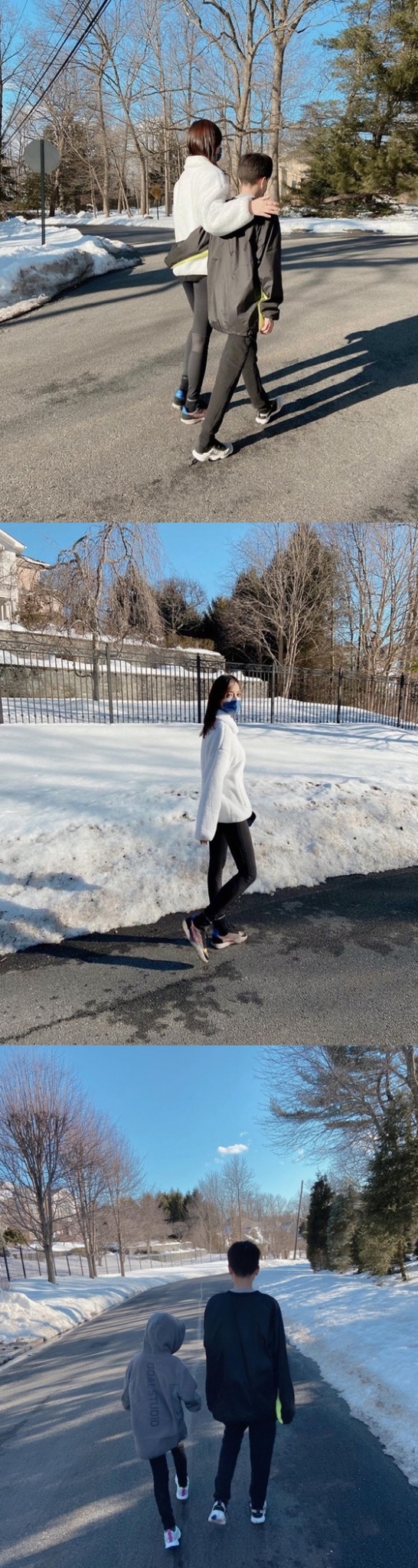 배우 손태영이 아이들과 함께 산책하는 근황을 공개했다.
