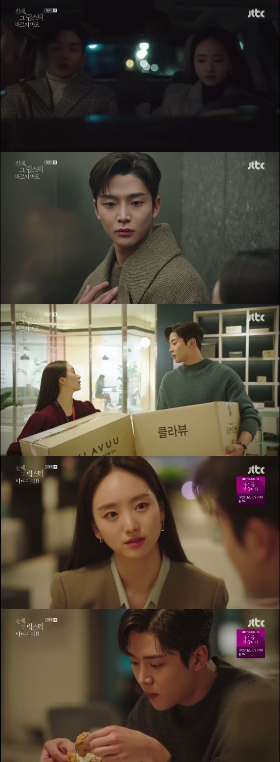 9일 오후 방송된 JTBC 월화드라마 '선배, 그 립스틱 바르지마요'에는 채현승(로운 분)이 윤송아(원진아 분) 직진에 마음을 여는 장면이 담겼다.