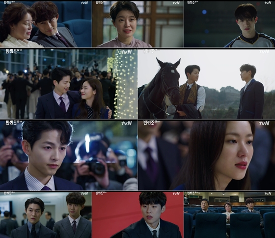 이날 방송에서는 바벨그룹과 신광은행의 투자협약을 막기 위한 빈센조(송중기 분), 홍차영(전여빈 분)의 신박한 작전이 웃음을 안겼다. 빈센조는 비주얼 치트키를 활용해 신광은행장 황민성(김성철 분)의 마음을 흔드는데 성공, 투자협약이 엎어지도록 손을 썼다. 비록 최명희(김여진 분)의 역습에 작전은 실패로 돌아갔지만, 악당 황민성만큼은 확실하게 징벌할 수 있었다.