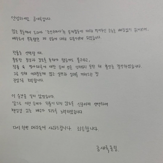 금새록은 27일 오후 자신의 인스타그램에 "많은 분들께서 드라마 '조선구마사'의 문제점들에 대해 적어주신 글들을 빠짐없이 읽어보며 배우로서 부족했던 제 모습에 대해 되돌아보게 됐다"며 자필로 글을 작성했다.