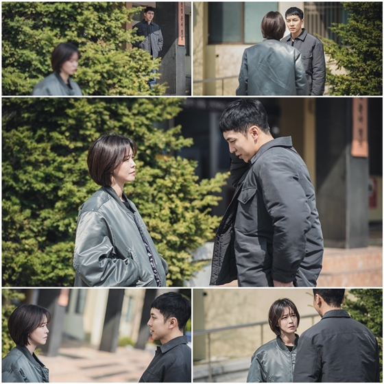 이와 관련 오는 31일 방송되는 '마우스' 9회에서는 이승기와 경수진이 어색한 기류 속 1대 1로 서로를 대면한 투샷이 그려진다. 극중 정바름이 최홍주(경수진 분)와 경찰서 앞에서 조우하는 장면. 서에서 나오던 정바름은 최홍주를 발견한 뒤 잠시 걸음을 멈춰 지켜보고, 조심스럽게 다가가 최홍주 앞에 선다. 이어 정바름은 최홍주와 몇 마디 대화를 이어가는 듯하지만, 어찌할 바 모르겠다는 듯 허둥지둥대며 눈도 제대로 마주치지 못하고, 반면 최홍주는 그런 정바름의 행동을 묵묵히 지켜본다.
