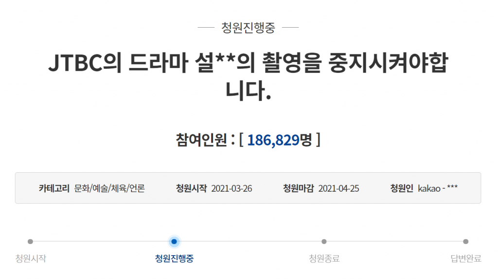 특히 국민청원에 올라온 게시글 'JTBC의 드라마 설**의 촬영을 중지시켜야합니다'에서는 "작품의 설정을 무시하라지만 설정 자체가 현 피해자에게 모욕을 주는 것이다. 노골적으로 정치 압력이 들어간 것 같다"고 지적했다.