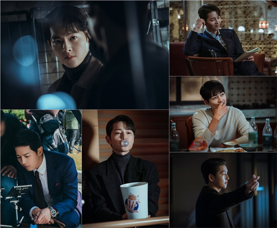 tvN 토일드라마 '빈센조'(극본 박재범, 연출 김희원, 기획 스튜디오드래곤·제작 로고스필름) 측은 8일, 마피아 빈센조로 레전드 활약을 선보이고 있는 송중기의 비하인드 컷을 공개했다.