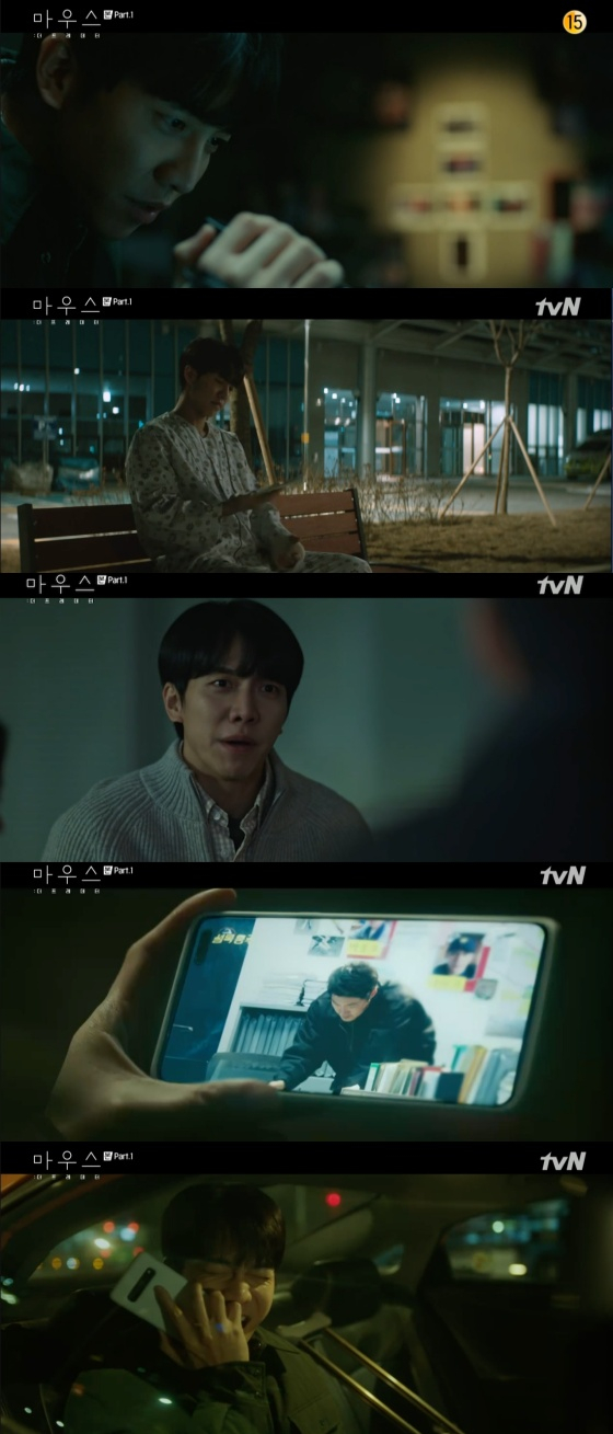 28일 오후 방송된 tvN 수목드라마 '마우스 : 더 프레데터'에는 김한국을 납치한 사이코패스 정바름(이승기 분)이 형사 고무치(이희준 분)를 옆에 두고 조롱하는 장면이 그려졌다.