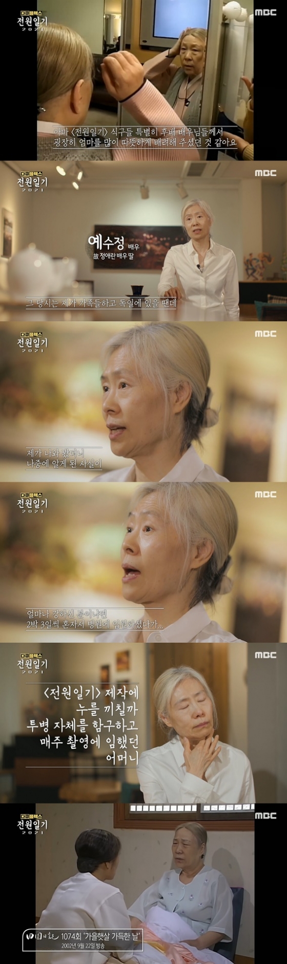 이날 방송에서는 2021년 부활한 '전원일기'에 함께 하지 못하는 고 정애란을 대신해 배우 예수정이 출연했다. 큰 어른 정애란의 빈자리를 그녀의 딸이 추억했다.