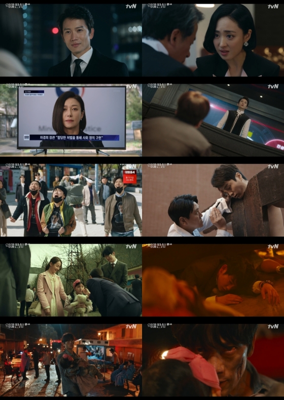 김가온은 '국민시범재판' 두 번째 케이스에서 강요한의 잔혹성을 한 번 더 체감했다. 강요한이 법무부 장관 차경희(장영남 분)의 아들 이영민(문동혁 분)을 기어코 상습 폭행범으로 단두대에 올려세운 뒤 '사랑의 매' 태형 30대라는 충격적인 형벌로 재판을 종결한 것.