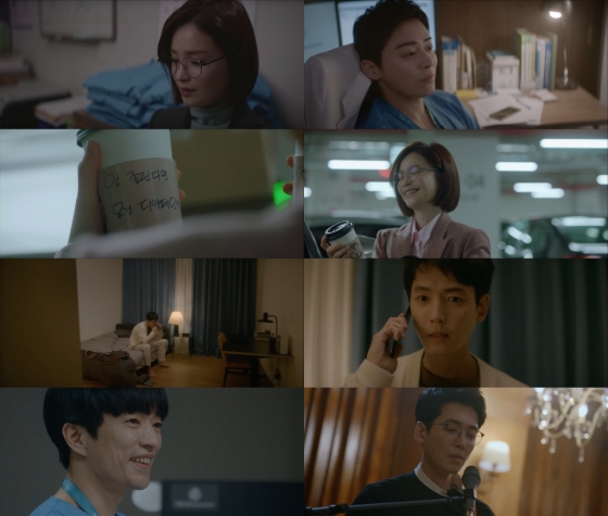 먼저 지난 1화 엔딩에서는 익준(조정석 분)의 고백에 담담한 거절을 한 송화(전미도 분)의 모습이 시선을 사로잡았다. 애써 미소를 지으며 침묵으로 일관하던 익준이 홀로 남겨진 방 안에서 보인 쓸쓸한 표정은 보는 이들의 안타까움을 자아냈다. 2화 엔딩에서는 늦은 시간 퇴근으로 피곤한 송화의 차 앞에 커피가 놓여 있어 눈길을 끌었다. 송화를 배려한 듯한 두 개의 커피에는 메시지가 쓰여 있었고, 그녀는 누군지 알겠다는 듯 환한 미소를 지어 호기심을 고조시켰다.