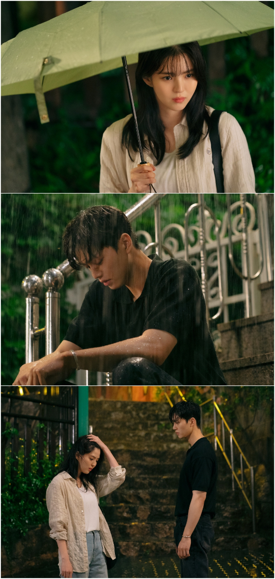 끝나지 않은 변수들로 가득한 연애 게임이 결말을 향해가는 가운데, 쏟아지는 빗속에서 마주한 유나비와 박재언의 모습이 흥미를 자극한다. 공개된 사진 속 유나비는 날 선 표정으로 누군가를 바라보고 있다. 그 시선 끝에 유나비의 집 앞 계단에 앉아있는 박재언이 보인다. 이미 오랜 시간 비를 맞고 있었던 듯, 박재언은 흠뻑 젖어 있다. 떨군 고개에서 느껴지는 무거운 감정은 보는 이의 마음을 애처롭게 만든다. 이어진 사진 속 두 사람 사이에는 한층 위태로운 텐션이 흐른다. 밀려드는 감정에 혼란스러워하는 유나비와 굳은 얼굴로 서 있는 박재언. 폭발 직전의 두 사람의 분위기가 궁금증을 높인다.