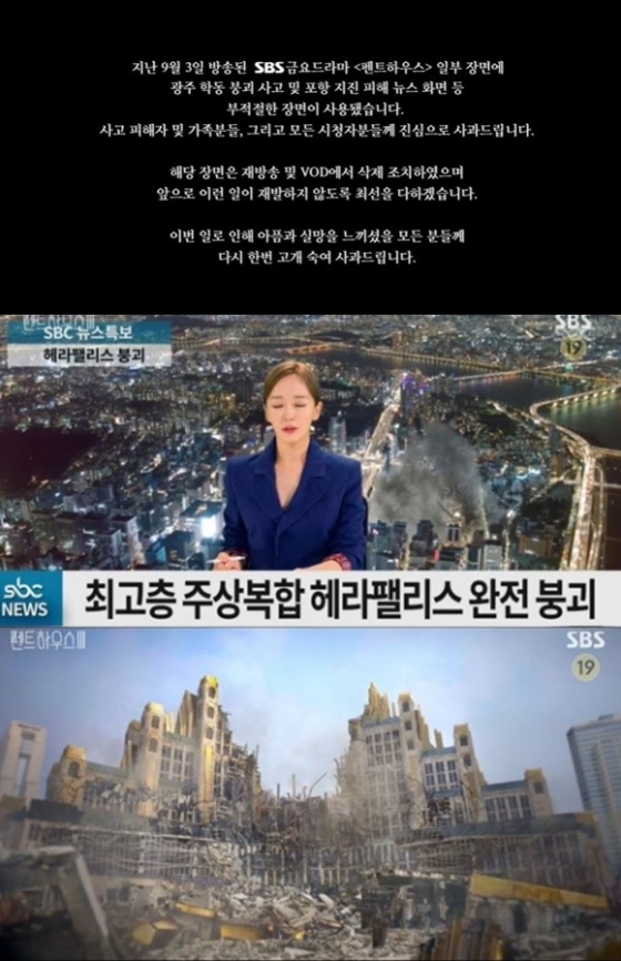 '펜트하우스 시즌3'에서 지난 9월 3일 방송 장면에서 광주 학동 붕괴 사고 현장을 이용것과 관련해 사과했다.