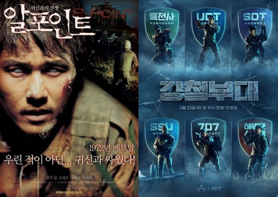 군 소재는 한정적일 것 같지만 다양하다. 영화 '알포인트'는 1972년 베트남전에 참전한 대한민국 육군이 귀신과 싸웠던 내용으로 한국 공포물 중 수작으로 꼽혔고, MBC 예능 '진짜 사나이'는 연예인들이 직접 군대로 뛰어든 리얼 체험으로 최고 시청률 19.8%에 시즌제 편성까지 했다. 이를 패러디한 유튜브 '가짜사나이'는 인터넷 방송인들이 UDT(해군 특수전전단) 훈련을 체험하는 과정을 '인간 개조'의 다큐멘터리 형태로 보여주며 1기 1화 조회수만 1000만뷰를 넘는 등 인기몰이를 했다. 채널A, SKY 예능 '강철부대'는 특전사, 해병대수색대, 707특수임무단, UDT, SDT, SSU의 최정예 특수부대 출신 예비역들이 팀을 이뤄 각 부대의 명예를 걸고 싸우는 밀리터리 서바이벌로 신드롬을 일으켰다.
