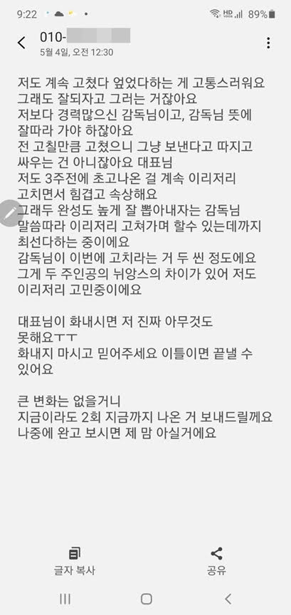 이어 "이후 7월에 제작사와 감독, 작가가 만나 대본에 관해 논의를 했다. 당시에도 앞서 요청했던 캐릭터 분량에 대한 수정이 이뤄지지 않았다"며 "이지훈 배우가 감독과 메시지를 주고 받았던 것은 캐릭터 설정과 관련된 부분이었고, 감독을 믿고 가겠다고 했다. 분량에 대한 이야기를 했던 것이 아니"라며 배우와 감독의 카톡 내용도 공개했다.