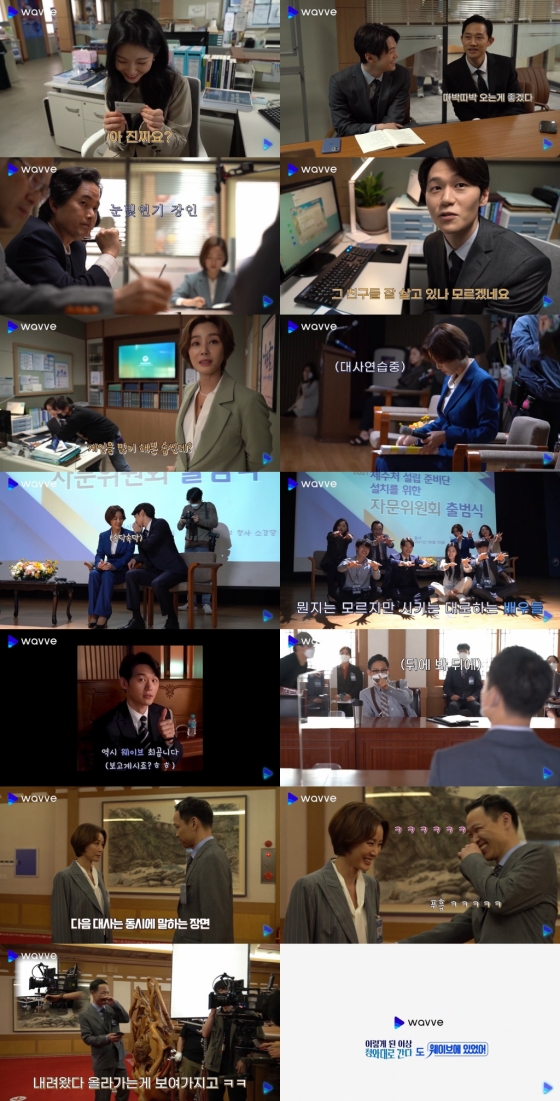 김성령의 연설 장면을 지켜보던 이학주는 "너무 행복하게 촬영하고 있고, 저만 열심히 하면 될 것 같습니다"라며 화기애애한 촬영장 분위기를 과시하기도. 그뿐만 아니라 "웨이브 최곱니다"라고 덧붙이며 틈새 어필도 잊지 않는 재치 있는 모습으로 시청자들을 절로 미소 짓게 한다.