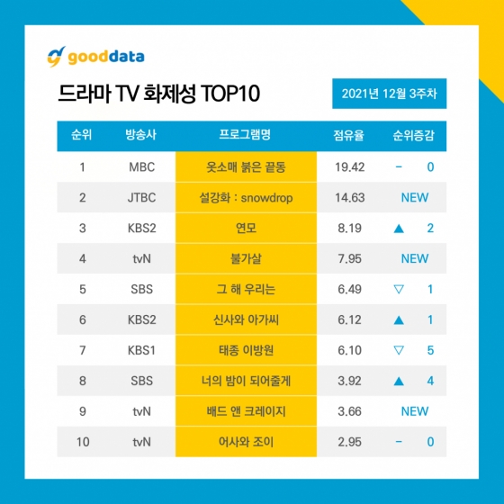 JTBC 신작 '설강화 : snowdrop'은 드라마 화제성 2위로 출발했다. 역사왜곡과 관련해 네티즌의 다양한 질타 의견이 발생하며 높은 화제성을 기록했으며, 방영 중단을 요청하는 여론이 두드러졌다. 지수와 정해인은 드라마 출연자 화제성 부문 4위와 9위로 진입했다.