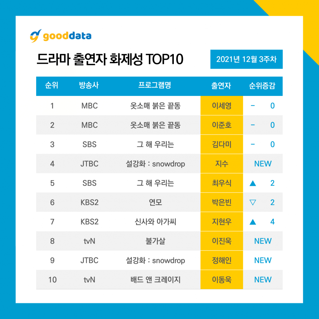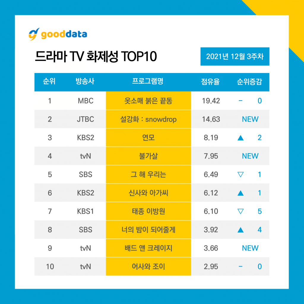 본 조사는 TV화제성 분석 기관 굿데이터코퍼레이션이 2021년 12월 13일부터 2021년 12월 19일까지 방송 중이거나 방송 예정인 드라마 26편을 대상으로 뉴스 기사, 블로그/커뮤니티, 동영상, SNS에서 발생한 네티즌 반응을 분석하여 12월 20일에 발표한 결과다.