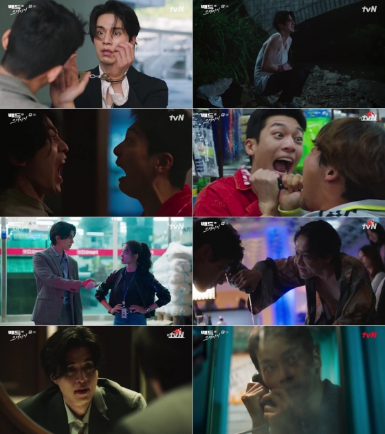 지난 24일 방송된 tvN 금토드라마 '배드 앤 크레이지'(연출 유선동, 극본 김새봄, 제작 스튜디오 드래곤·밍크엔터테인먼트) 3회에서 류수열(이동욱 분)은 자신의 또 다른 인격이자 양심 K(위하준 분)의 존재를 확인한 후 충격에 사로잡혔다. 류수열은 청천벽력 같은 상황에 "너 뭐야? 나한테 어떻게 한 거야? 무슨 짓을 한 거야?"라며 분노한 것도 잠시 자신을 대신해 국회의원 도유곤(임기홍 분)에게 발차기와 따귀세례를 퍼붓던 K의 행동으로 인해 동료들에게 쫓기는 도망자가 돼 시청자들에게 웃음을 안겼다.