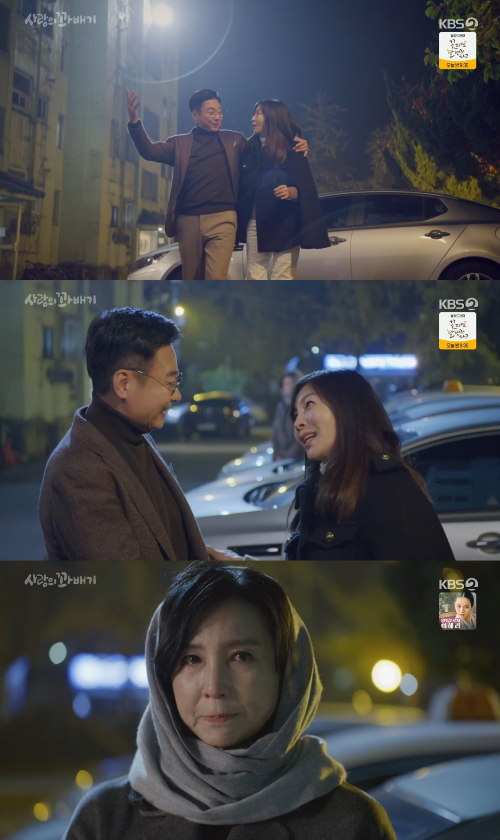 27일 오후 방송된 KBS 2TV 일일드라마 '사랑의 꽈배기'에서는 오광남(윤다훈 분)과 박희옥(황신혜 분)이 장을 보고 박희옥의 집으로 들어가는 장면이 그려졌다. 그리고 맹옥희(심혜진 분)가 두 사람의 불륜을 목격했다.
