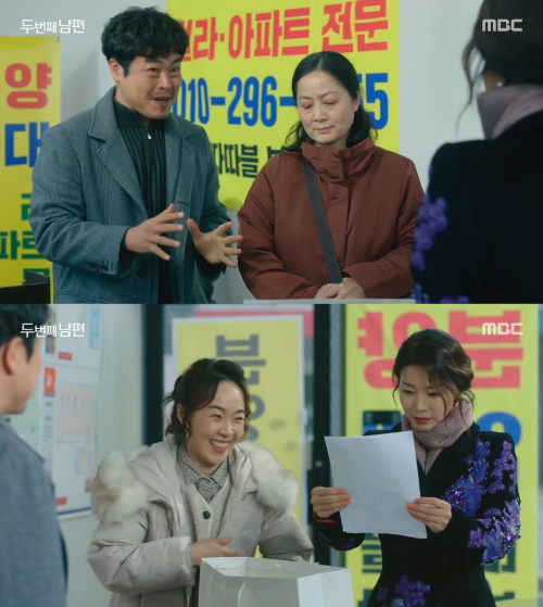 29일 오후 방송된 MBC 일일드라마 '두 번째 남편'에서는 양말자(최지연 분)과 박행실(김성희 분)이 부동산을 찾아 재개발될 집을 계약하는 모습이 담겼다.