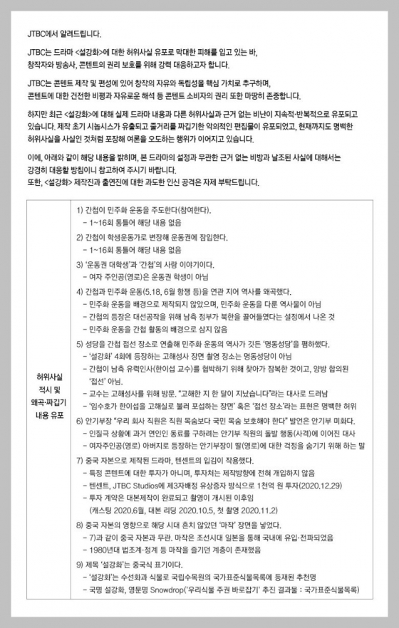 드라마 '설강화:snowdrop'(극본 유현미, 연출 조현탁, 이하 '설강화')를 둘러싼 역사왜곡 논란이 계속된 가운데 JTBC가 법적 대응을 예고했다.