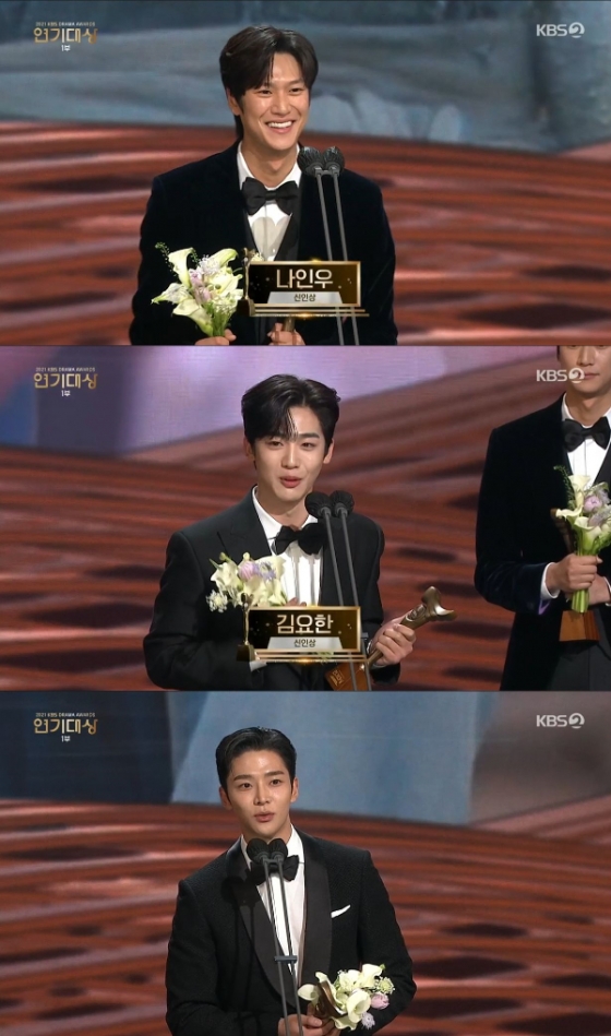 배우 나인우와 김요한, 로운이 '2021 KBS 연기대상'에서 신인상을 받았다.