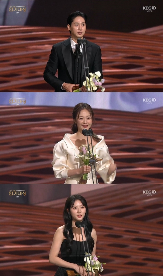 배우 박성훈과 전소민, 김새론이 '2021 KBS 연기대상'에서 드라마스페셜·TV 시네마 상을 받았다.