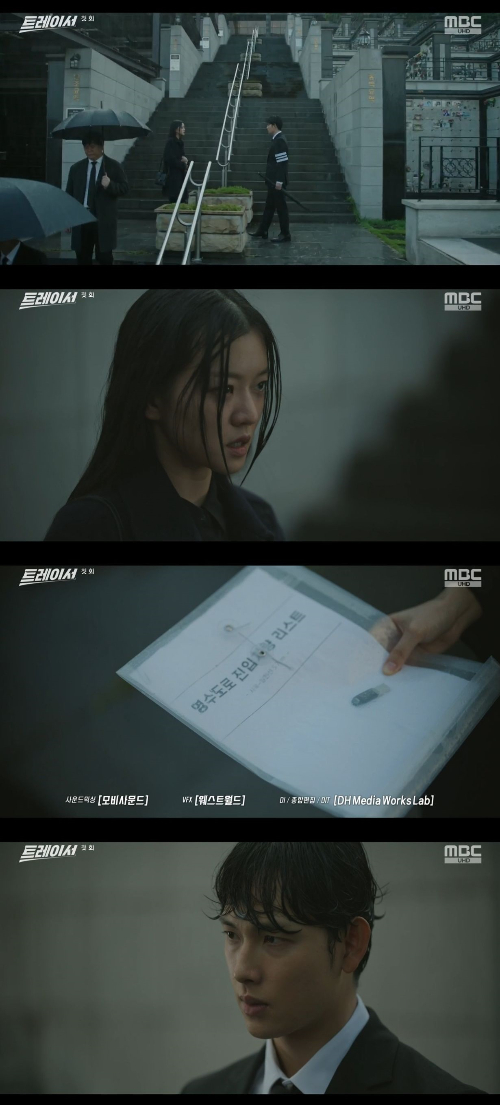 7일 밤 첫 방송 된 MBC 새 금토 드라마 '트레이서'에서 황동주(임시완 분)는 아버지 황철민(박호산 분)의 발인을 마치고 나오는 길에 서혜영(고아성 분)과 마주치는 모습이 담겼다.
