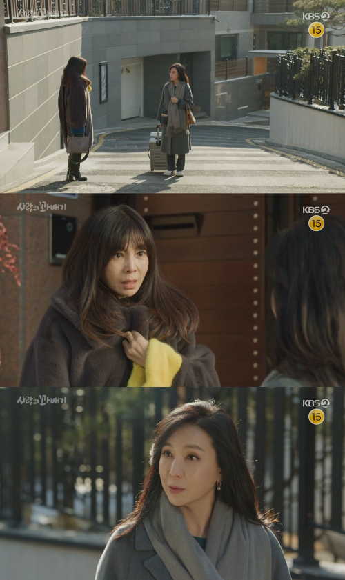 3일 오후 방송된 KBS 2TV 일일드라마 '사랑의 꽈배기'에서는 맹옥희(심혜진 분)와 박희옥(황신혜 분)이 박희옥의 집 대문 앞에서 대화하는 모습이 담겼다.