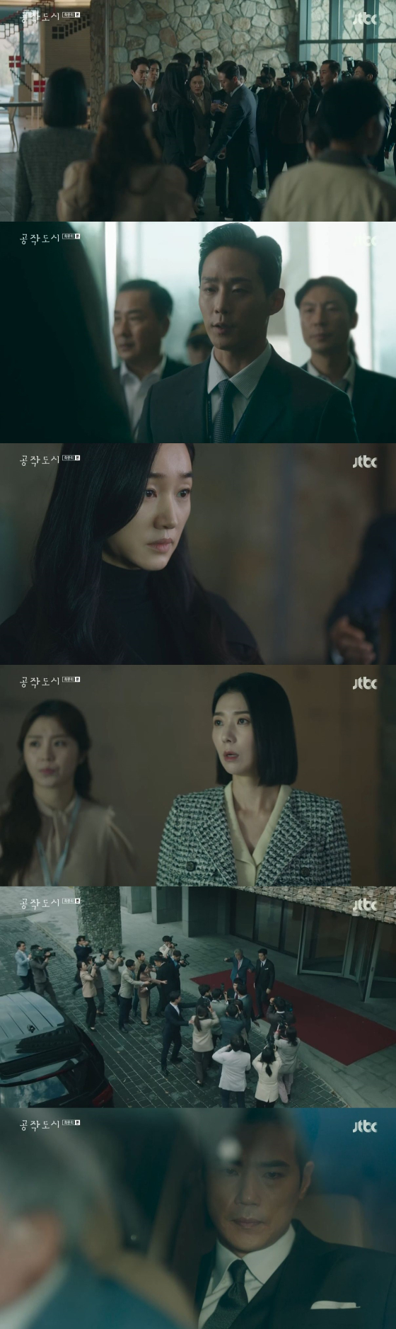 10일 오후 방송된 JTBC 수목드라마 '공작도시'에서 윤재희(수애 분)와 박정호(이충주 분)가 기자들에 둘러싸여 미술관에서 대치하는 모습이 담겼다.
