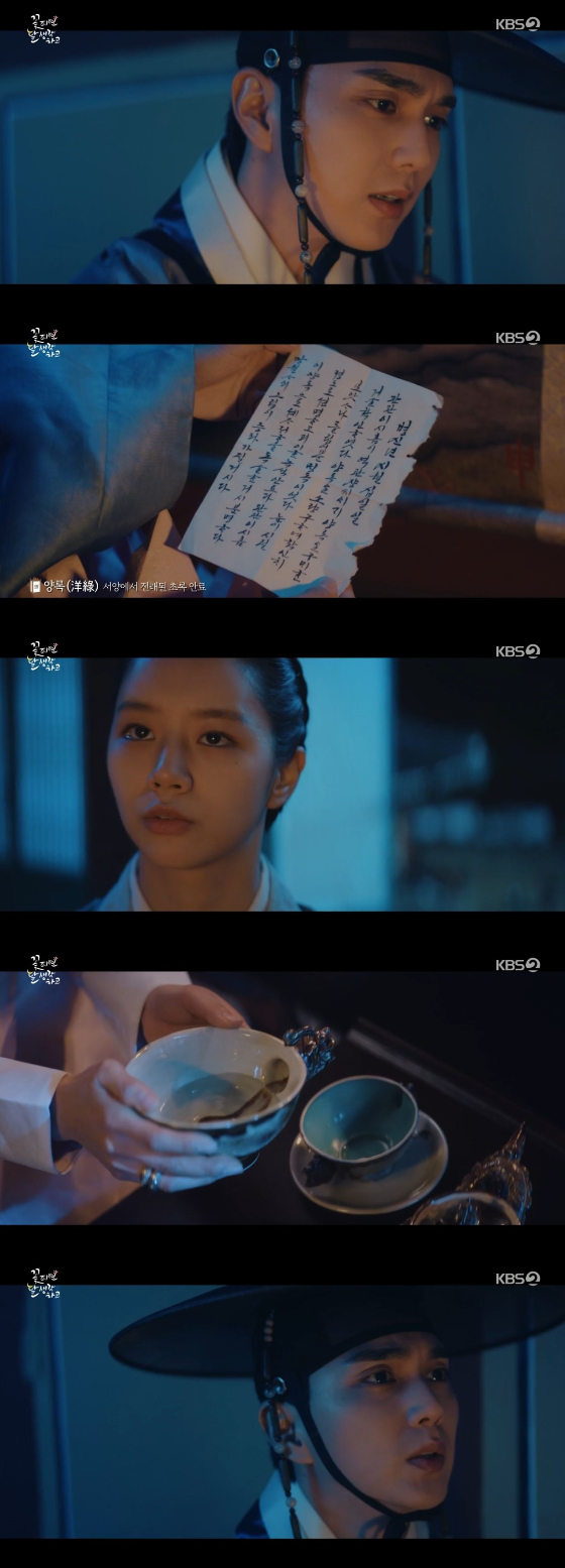 그때 남영은 그림 뒤에 숨겨진 서찰을 발견했다. 강로서는 서찰을 읽어내렸다. "판관 이시흠(최원영 분)이 역관 장 씨에게 양록을 구매한 것을 확인하였다. 양록을 소량 구하여 확인해보았으나 틀림없는 맹독이었다. 눈이 시릴 정도로 선명하고 괴이한 녹색 원료다"라고 했다. 이에 남영은 "찻잔을 보았소. 주상전하(정성일 분)가 위험하오"라고 소리쳤다.