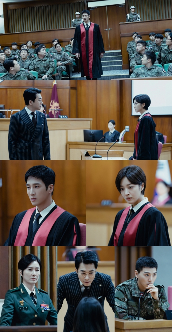 먼저 첫 번째 스틸은 지난 4회 엔딩에서 가장 강렬한 임팩트를 선사했던 도배만의 위풍당당한 법정 런웨이를 포착했다. 법정 안에 있는 모든 이들의 시선을 받으며 거침없는 발걸음으로 재판장으로 향하고 있는 도배만의 모습은 제대로 각성한 그의 앞으로의 행보를 더욱 궁금케 한다. 이어 또 다른 스틸에는 한 치의 양보 없는 팽팽한 대립각을 형성하고 있는 차우인과 용문구의 모습이 담겨있다. 성범죄 사건을 일으키고 군대로 도피 입대를 한 노태남에게 반드시 그 죗값을 치르게 하겠다는 군검사 차우인과 노태남의 변호인으로 나선 용문구. 서로를 향해 불꽃 튀는 눈빛을 보내고 있는 이들의 모습에서는 법정의 살얼음판 분위기가 고스란히 전달되고 있다.