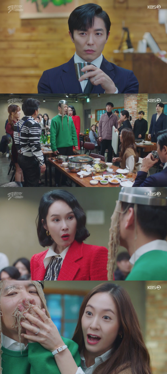 21일 방송된 KBS 2TV 월화드라마 '크레이지 러브'에서는 노고진(김재욱 분)과 이신아(정수정 분), 김차배(정성호 분), 마은정(백주희 분) 등 직원들이 고기집에서 회식하는 모습이 담겼다.