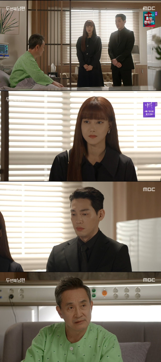 25일 오후 방송된 MBC 일일드라마 '두 번째 남편'에게서는 윤재경(오승아 분)과 김수철(강윤 분)이 윤대국 회장(정성모 분)의 병실에 방문하는 모습이 담겼다.