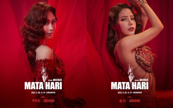 소용돌이치는 운명 속에서도 자신의 삶을 당당하게 받아들이는 마타하리 역의 옥주현은 긴 웨이브 헤어스타일에 강렬한 레드 드레스를 입은 채 고혹적인 눈빛을 보내고 있다. 초연부터 재연, 그리고 이번 세 번째 시즌까지 작품에 함께하는 옥주현은 화려한 겉모습 이면의 섬세한 감정을 극대화하며 사진 한 장만으로도 완벽한 '마타하리'의 모습을 표현했다. 이번 시즌 '마타하리' 역으로 새롭게 합류한 K-팝 보컬리스트 솔라는 아름다운 무희이자 당대 최고의 매혹의 아이콘으로 완벽 변신했다. 매력적인 외모와 화려한 드레스를 입은 솔라는 관능적이면서도 신비로운 분위기로 격정적인 마타하리의 삶을 오롯이 담아내 그녀가 펼쳐낼 무대에 대한 기대감을 높였다.