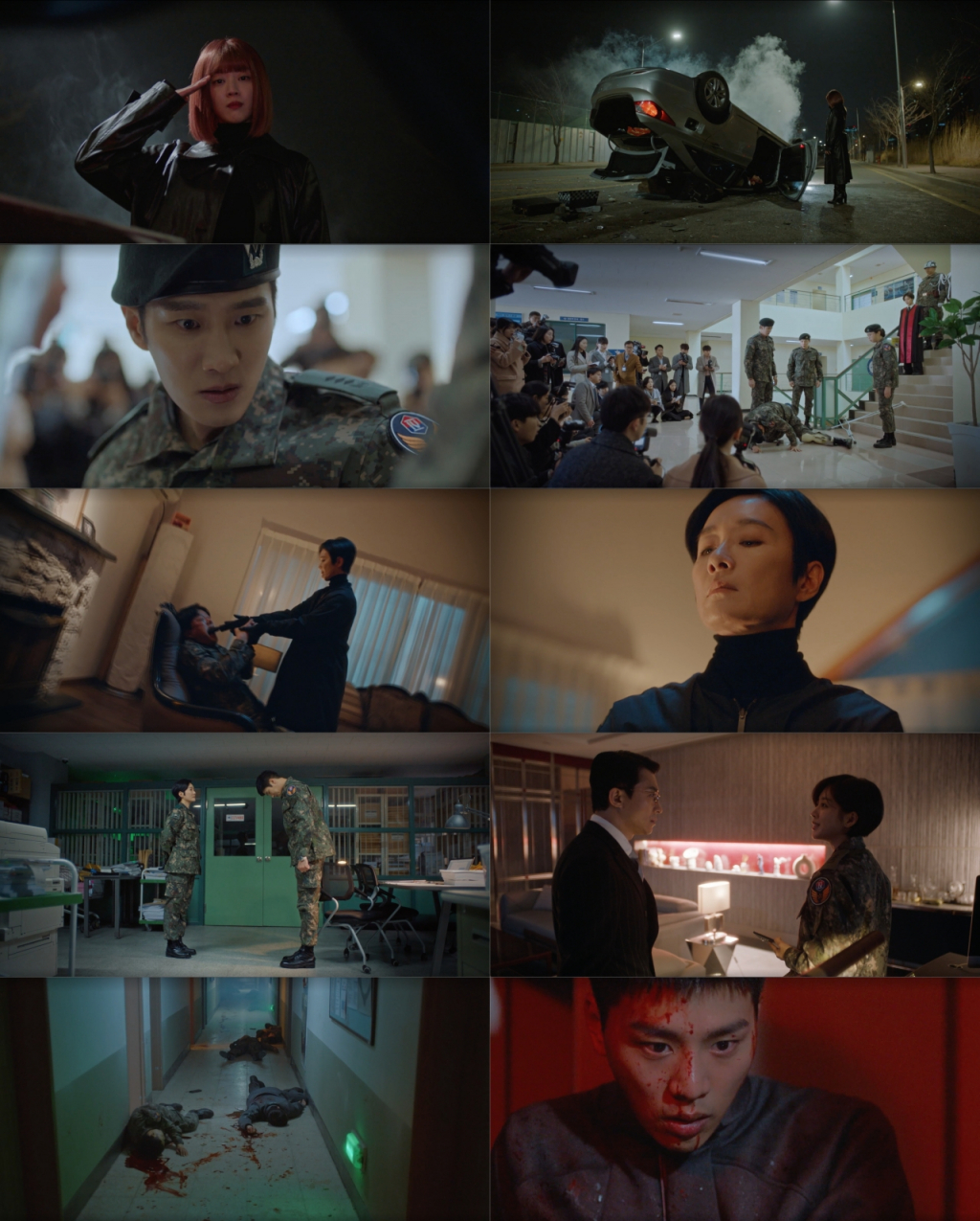 지난 12회의 엔딩 장면은 역대급 사건 발생을 예고하며 시청자들을 충격 속에 빠뜨렸다. 탈영 후 최전방 부대에 배치된 노태남에게 닥친 최악의 위기를 포착한 것. 노태남은 그동안 유독 자신에게 친절하게 대해줬던 안수호 병장(류성록 분)이 황제 복무 사건의 당사자라는 것을 알게 되면서 충격을 받았다. 안병장 역시 도배만을 통해 노태남의 정체에 대해 미리 알고 있었던 바. 안병장은 노태남이 자신의 정체를 알고 있다는 것을 눈치 채자마자 태도를 돌변해 폭행을 가했다. 이 가운데 피 범벅이 된 채 손에 소총을 들고 있는 노태남의 모습과 함께 총상을 입고 죽음을 맞은 병사들의 모습은 가장 충격적인 사건이 발생했음을 암시하며 절정을 향해 달려가는 '군검사 도베르만'의 다음 이야기를 더욱 궁금하게 만든다.