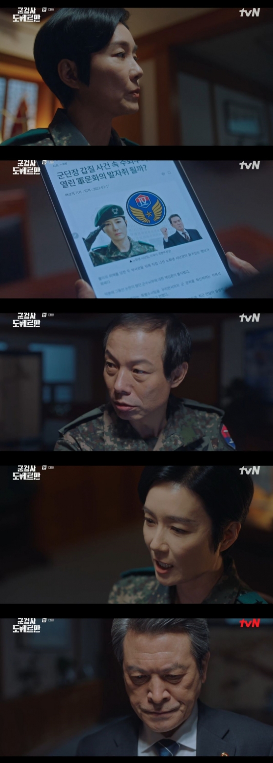 18일 방송된 tvN 월화 드라마 '군검사 도베르만'에서는 노화영(오연수 분) 사단장에 이재식(남경읍 분) 국방부 장관이 허강인(정인기 분) 부군단장과 함께 등장하는 모습이 담겼다.