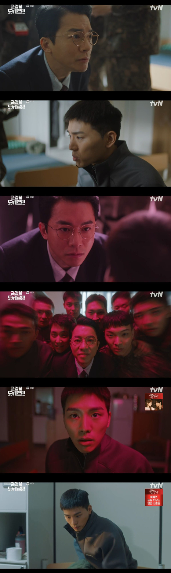 18일 방송된 tvN 월화 드라마 '군 검사 도베르만'에서는 노화영(오연수 분) 사단장의 아들 노태남(김우석 분) 이병이 용문구(김영민 분)를 만나는 모습이 담겼다.