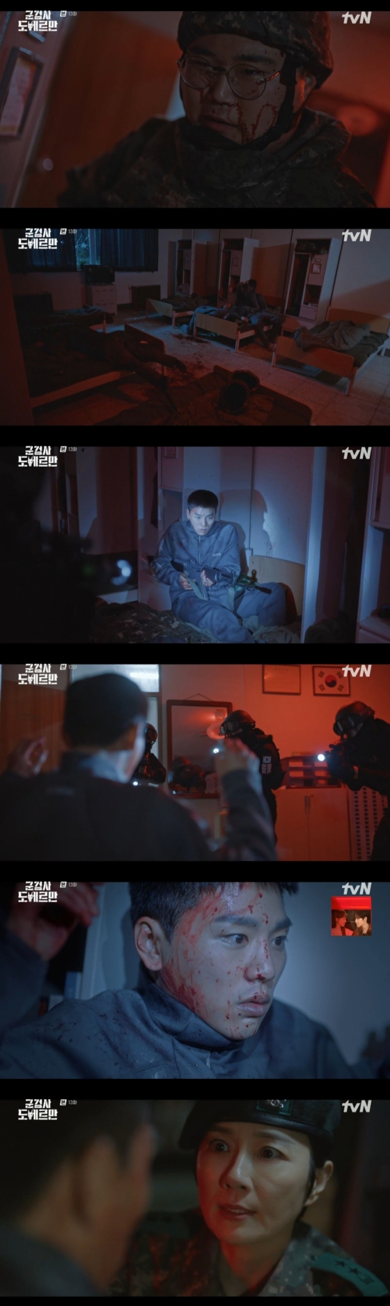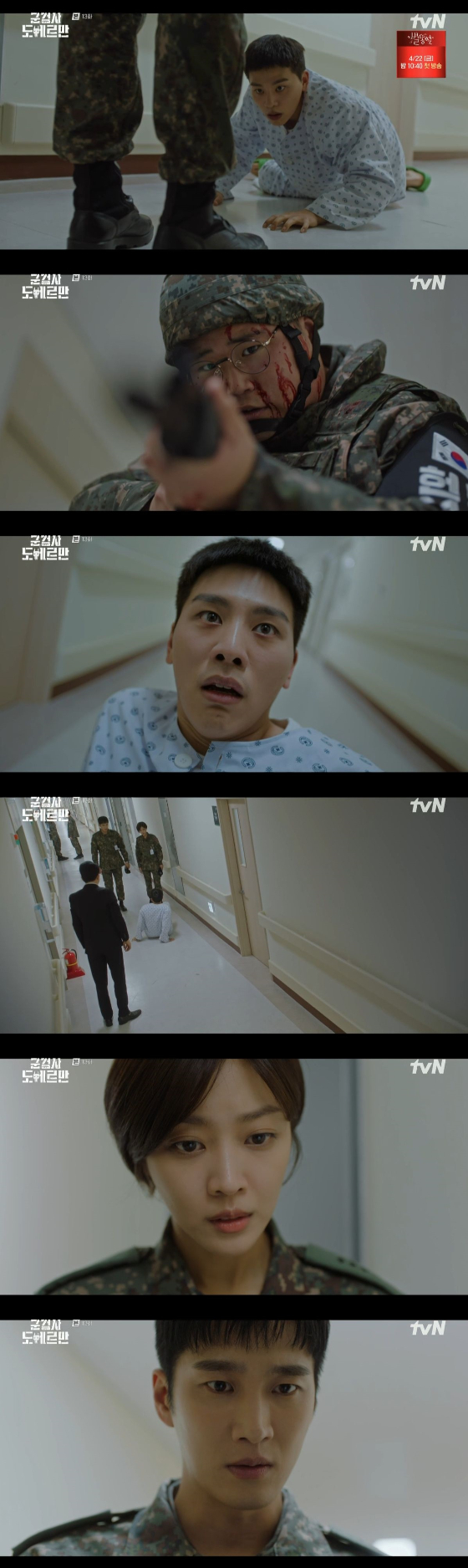 18일 방송된 tvN 월화 드라마 '군 검사 도베르만'에서는 노화영(오연수 분) 사단장의 아들 노태남(김우석 분) 이병이 병실에서 멍하니 있는 모습이 담겼다.
