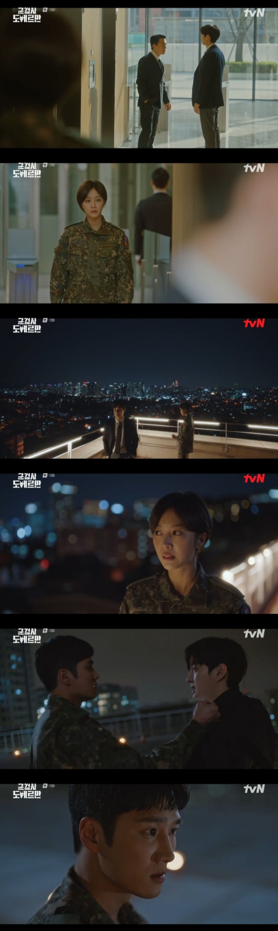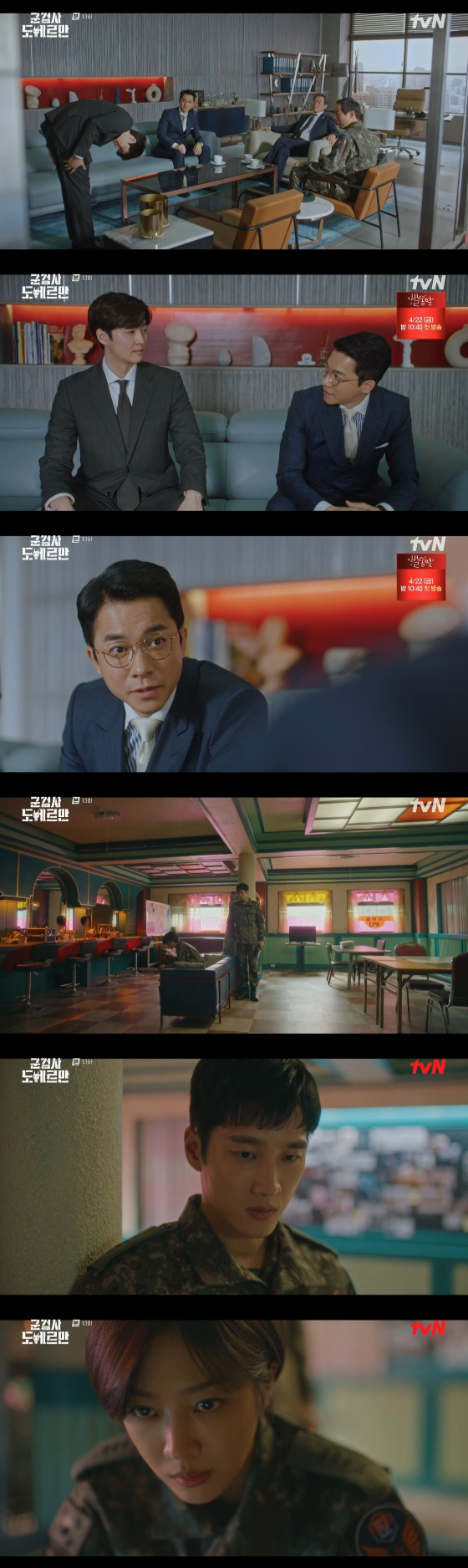 18일 방송된 tvN 월화 드라마 '군 검사 도베르만'에서는 차우인(조보아 분)이 용문구(김영민 분)와 함께 있는 강하준(강영석 분)을 발견하는 모습이 담겼다.