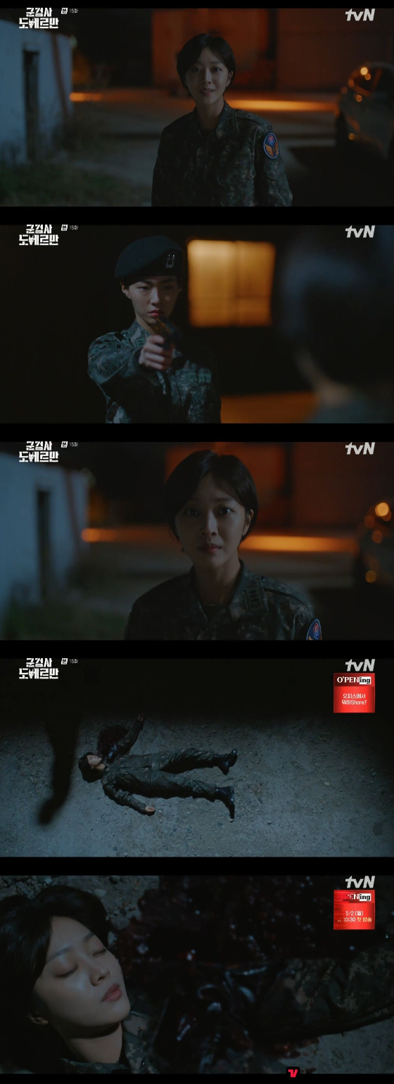 '군 검사 도베르만'에서 김우석이 극단적 선택을 하려고 던진 수류탄에 안보현과 김우석이 쓰러진 가운데, 조보아가 총에 맞았다.