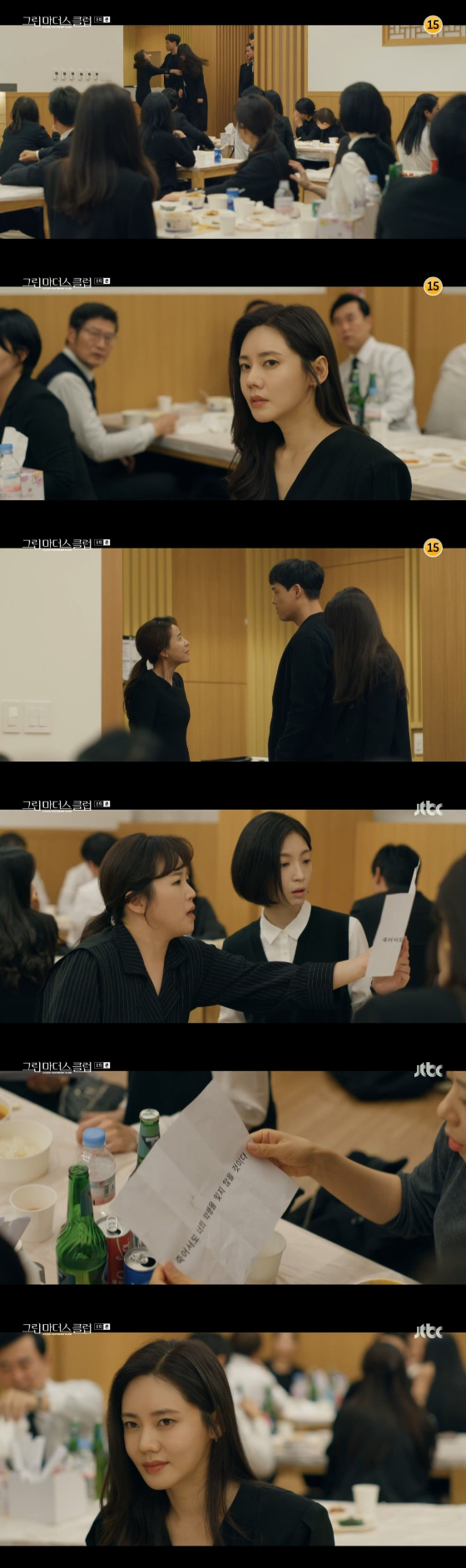 28일 방송된 JTBC 수목드라마 '그린마더스클럽'에서는 서진하(김규리 분)의 장례식장에 변춘희(추자현 분)와 학부모들이 한 대모여 식사하는 모습이 담겼다.