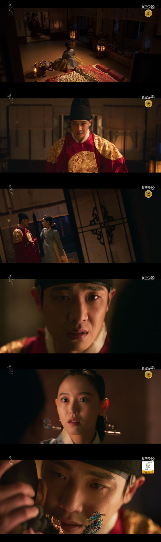 이날 방송에서 이태는 숙의가 머무는 곳으로 향했다. 이태는 "과인이 왔다. 어디 얼굴 한번 보자"라며 숙의를 일으켰다. 숙의는 다름 아닌 유정(강한나 분)이었다. 유정은 "선비님?"이라고 말한 뒤 용포를 입고 있는 이태의 모습에 놀랐다.